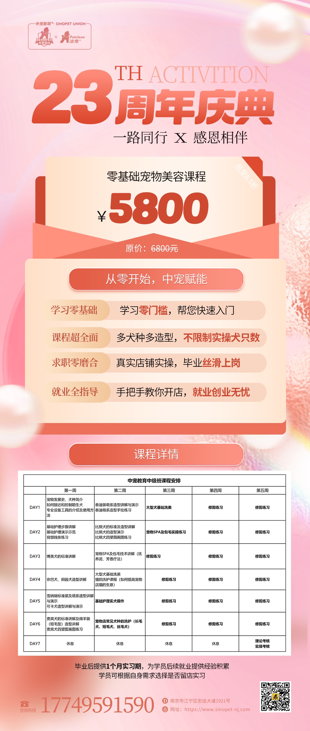 课程包括常见犬种的各种美容修剪方法(包括博美、西施、京巴、可卡雪纳瑞、贵宾、比熊、泰迪),商品学,店铺经营学,大型犬护理美容,包毛染色及SPA护理,还有犬的疾病及防治,繁殖,牵犬及训犬等。在整个学期中,每个学员能操作实犬20只以上。全部是每个人一人一只实犬操作。造型也大概20多种,在实际工作中所能遇到的造型基本上都会学到。若以后工作中遇到比较特殊的犬种,不太清楚的可以打电话向学校咨询。